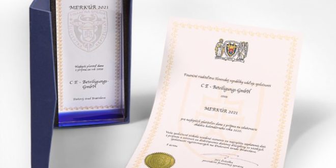 CE Beteiligungs-GmbH získala Merkura ako najlepší platiteľ danej z príjmu za zdaňovacie obdobie roka 2020 spomedzi všetkých spoločností registrovaných na Daňovom úrade Bratislava.